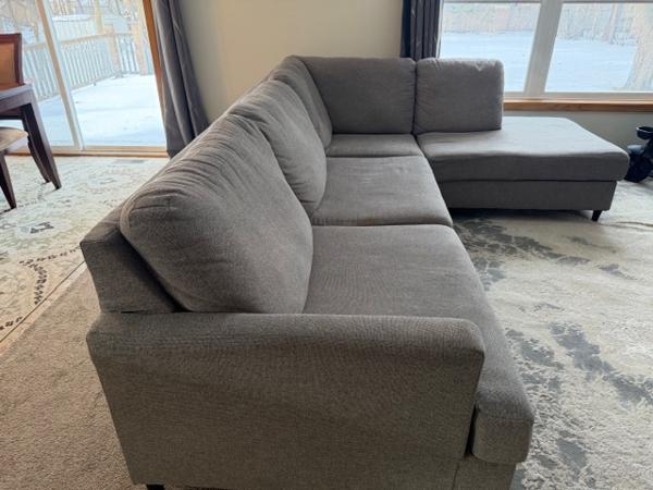 Spacious gray sectional couch in great condition. Very comfortable and perfect for living rooms, family rooms, or basements. Neutral gray color matches easily with any décor. Condition: ? Very good condition ? Clean, no tears, light stain ? Smoke-free and pet-free home Details: Sectional sofa (L-shaped) Color: Gray Seats multiple people comfortably Sturdy frame and supportive cushions